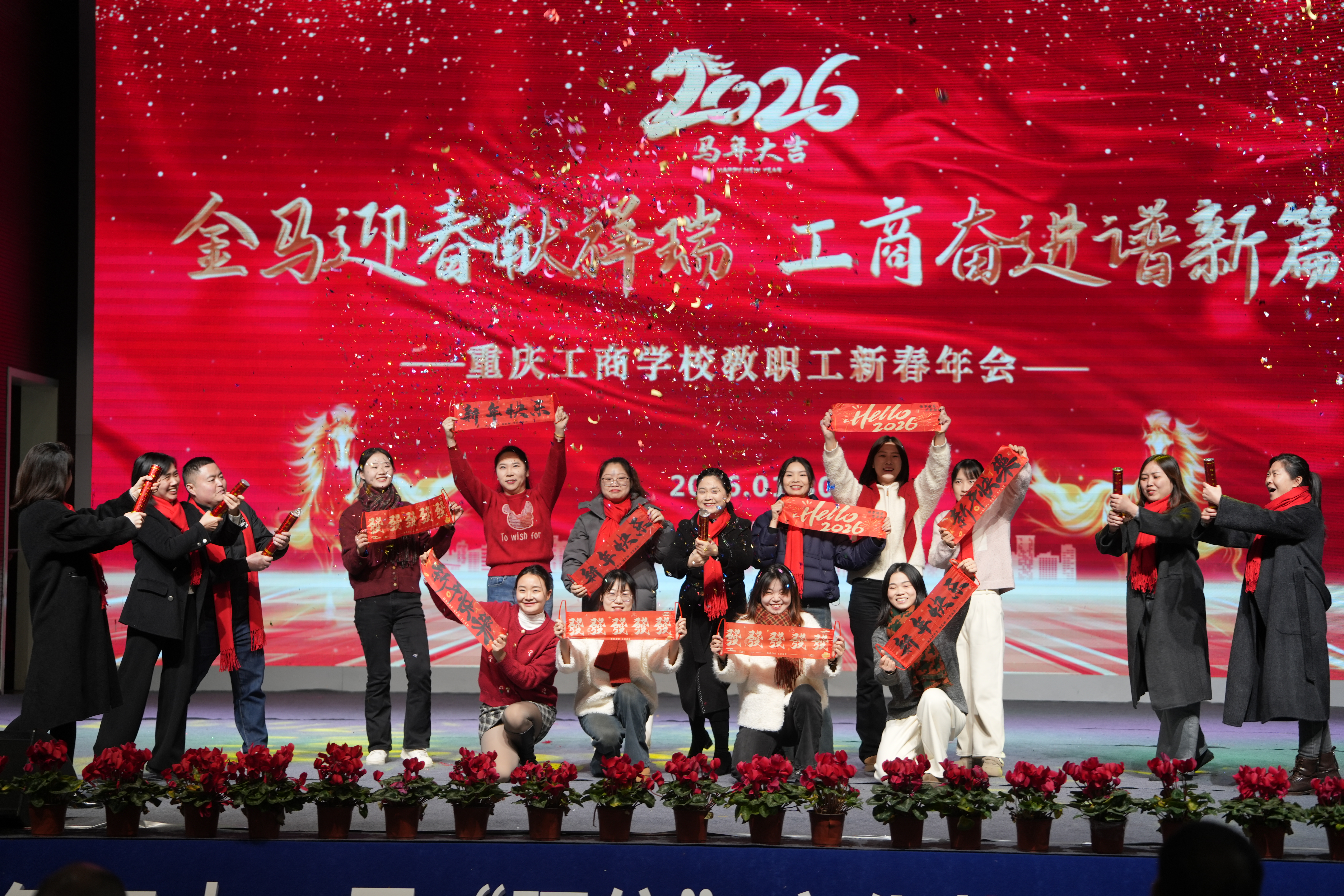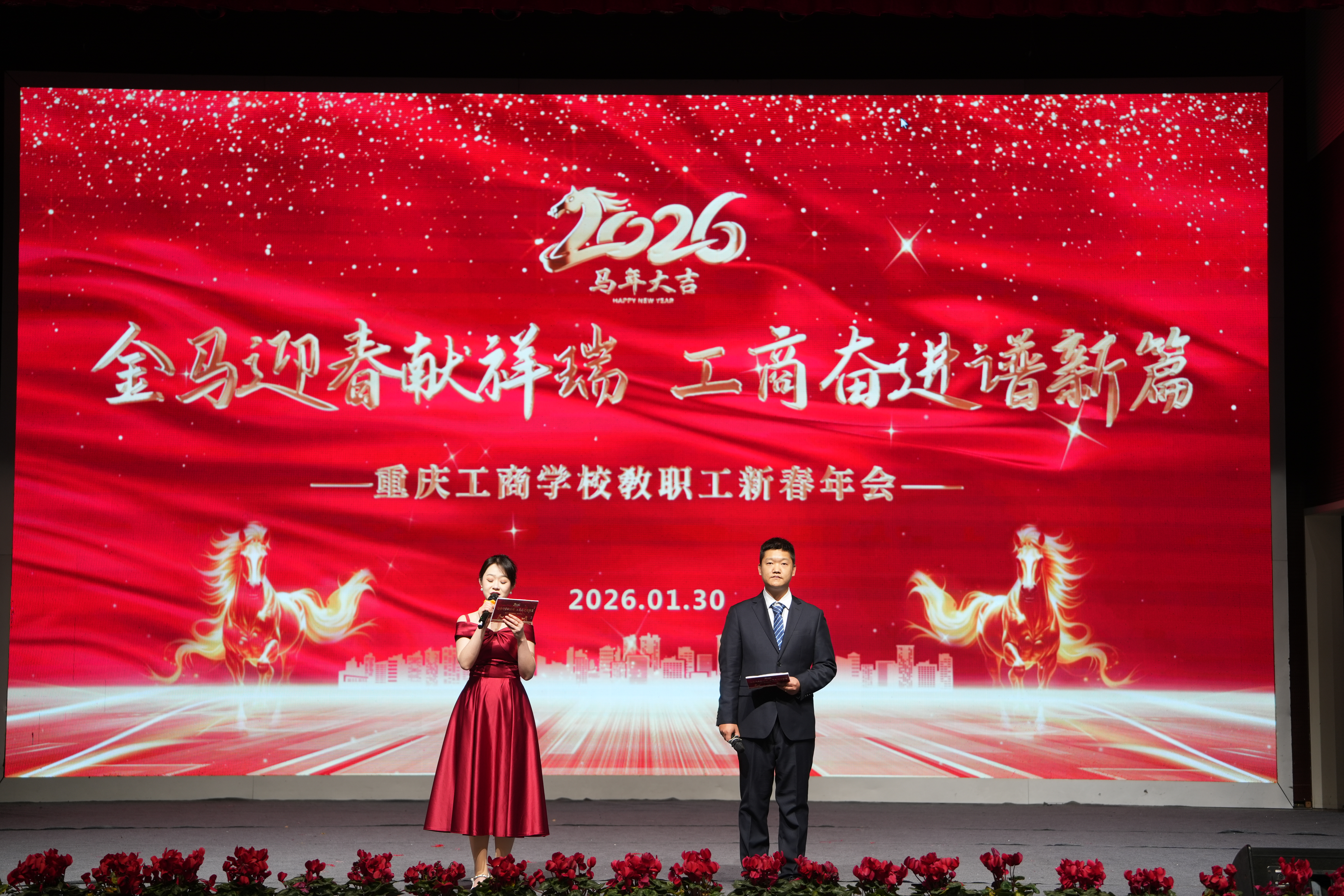 岁序更替,华章日新。1月30日,重庆工商学校校园内张灯结彩、暖意融融,教职工新春年会在学术报告厅隆重举行。全体教职工欢聚一堂,以丰富多彩的文艺表演共忆耕耘岁月,共话未来发展,喜迎丙午马年的到来。