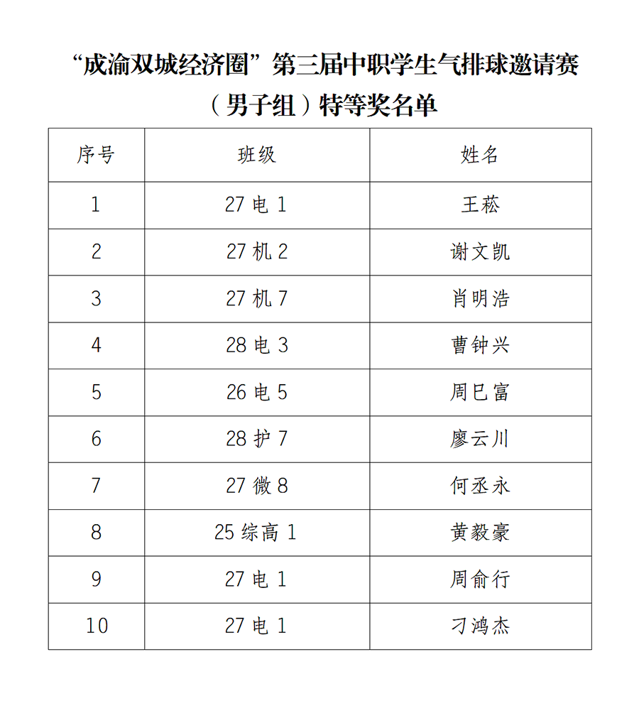 近日,我校男子气排球队代表重庆市出征“成渝双城经济圈”第三届中职学生气排球邀请赛,凭借过硬实力与顽强斗志勇夺男子组特等奖,充分彰显了工商学子卓越的体育素养与昂扬奋进的精神风貌,为学校、为重庆市赢得了荣誉。